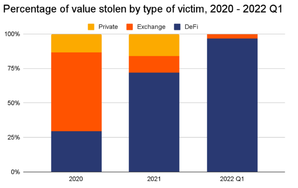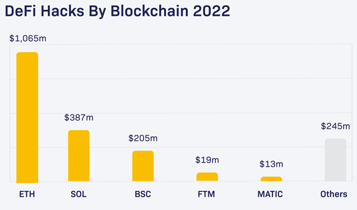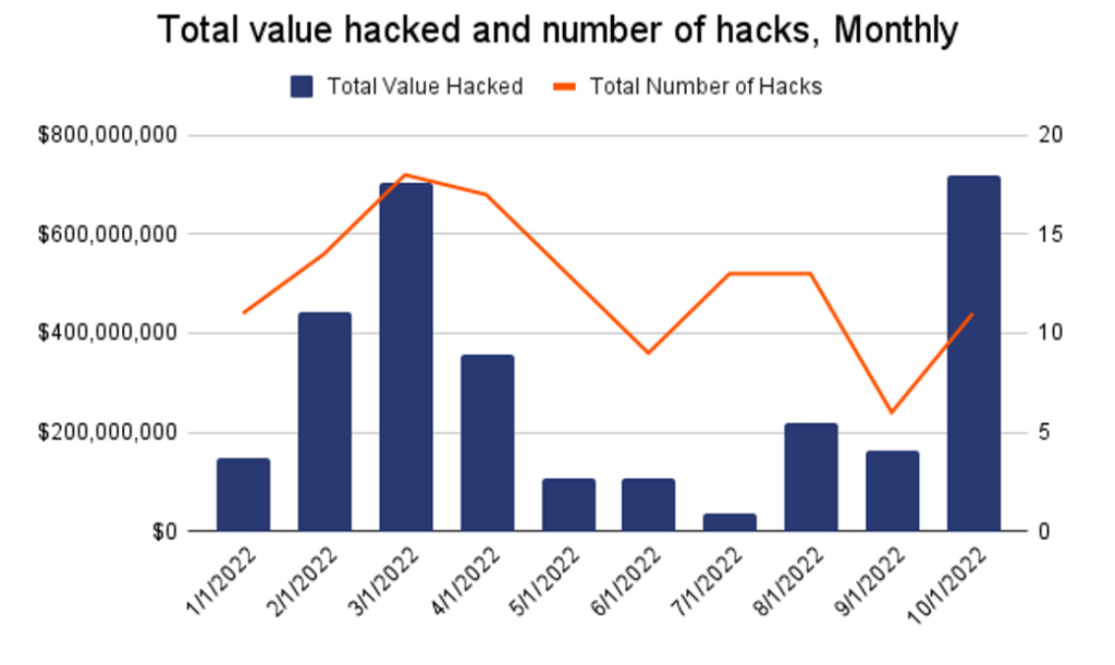 Focusing on this last year, 2022, the total value of stolen funds surged to almost $3B, that’s nearly double the $1.5B hackers took in 2021 and nearly 12 times the 2020 total. A pick of hacking was verified in the month of March, but then the month of October has been particularly significant reaching a record of about $760M in exploits in October.