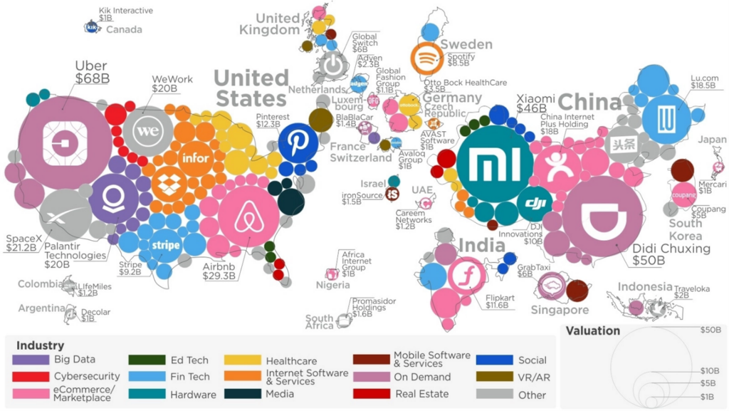 Some U.S.-based unicorns are Uber, Airbnb, SpaceX, Palantir Technologies, WeWork, and Pinterest. China claims several unicorns as well, including Didi Chuxing, Xiaomi, China Internet Plus Holding (Meituan Dianping), and Lu.com.