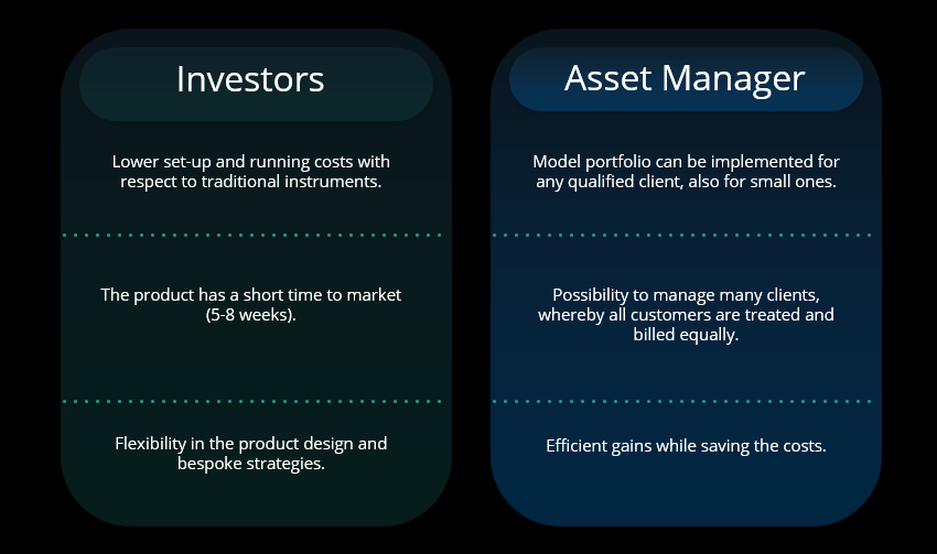 Financial company and fund manager and also for investors, who gain access to innovative/alternative strategies for portfolio’s diversification.”