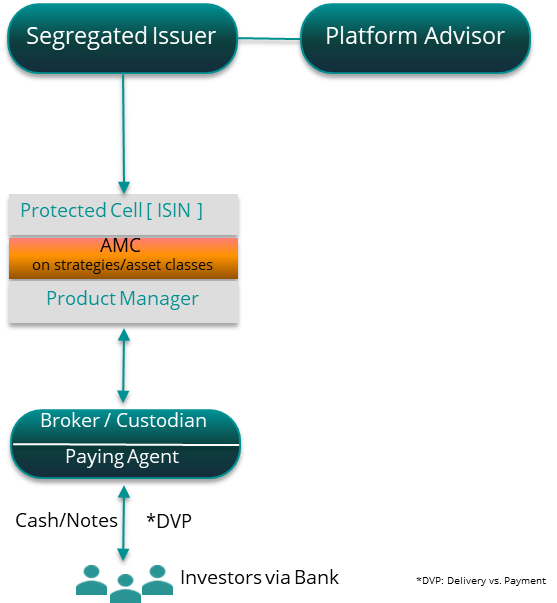 • The securitization vehicle provider (segregated issuer) is the company in charge of the set-up of the securitization vehicle from which the AMC will be issued. The securitization vehicle or segregated issuer, is a dedicated vehicle, which meets the professional requirements of Guernsey law, has no issuer risk, and is fully segregated. The vehicle can issue AMCs (Actively Managed Certificates), and cross-asset / cross-custodians. The AMC is an independent cell, which is not only segregated from the issuer itself but also from all other products of the same vehicle (if any).
