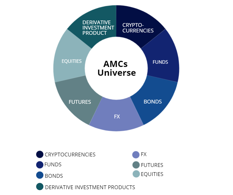 A wide range of underlyings are covered with the possibility to combine them across asset classes. Furthermore, AMCs can, depending on the pre-defined Investment Universe and Strategy, invest in structured products and other derivatives such as Forwards, Swaps, OTCs and listed Options.