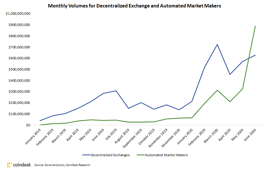 The chart compares the monthly volumes of decentralised trading that occur through AMM versus those that occur with traditional market makers. Hence the importance of Automated Market Makers, as their use has increased significantly since January 2020, managing to exceed the number of exchanges managed in a “classic” manner by June 2020.