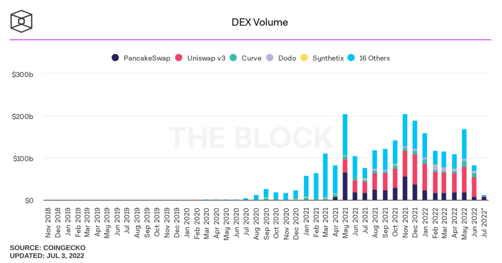 It is interesting to examine the growth phenomenon of decentralised exchanges based on AMM: the incredible growth that started in the year 2020, allowed in a few months, to reach volumes of $ 163.28 billion and then stabilise between 50 and 75 USD billion.