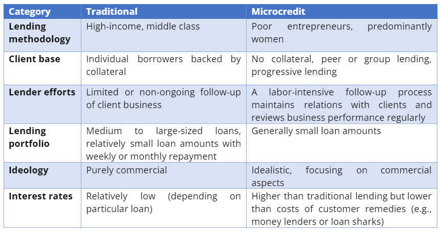 Microcredit provides loans, which usually range from $10 and $2,000. Its foundation is based on the idea that entrepreneurial potential exists even in underdeveloped areas without access to traditional banking. Repayment starts right away and is sometimes done so without formal contracts, which promotes trustworthiness and permits additional borrowing. Interest rates may apply, and savings accounts may serve as collateral. This approach, exemplified by a Bangladeshi group borrowing $27 in 1976 to kickstart their businesses, illustrates how collective lending mitigates individual risk and fosters economic growth. Microcredit is a symbol of empowerment since it gives borrowers access to capital and helps them launch enterprises, which in turn helps impoverished communities grow economically and become more resilient.