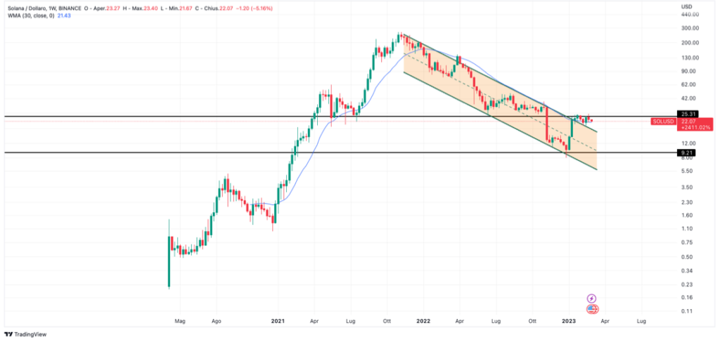 Making a straightforward technical analysis of Solana, with reference to the chart below, denotes a long bearish phase that started at the end of November 2022.